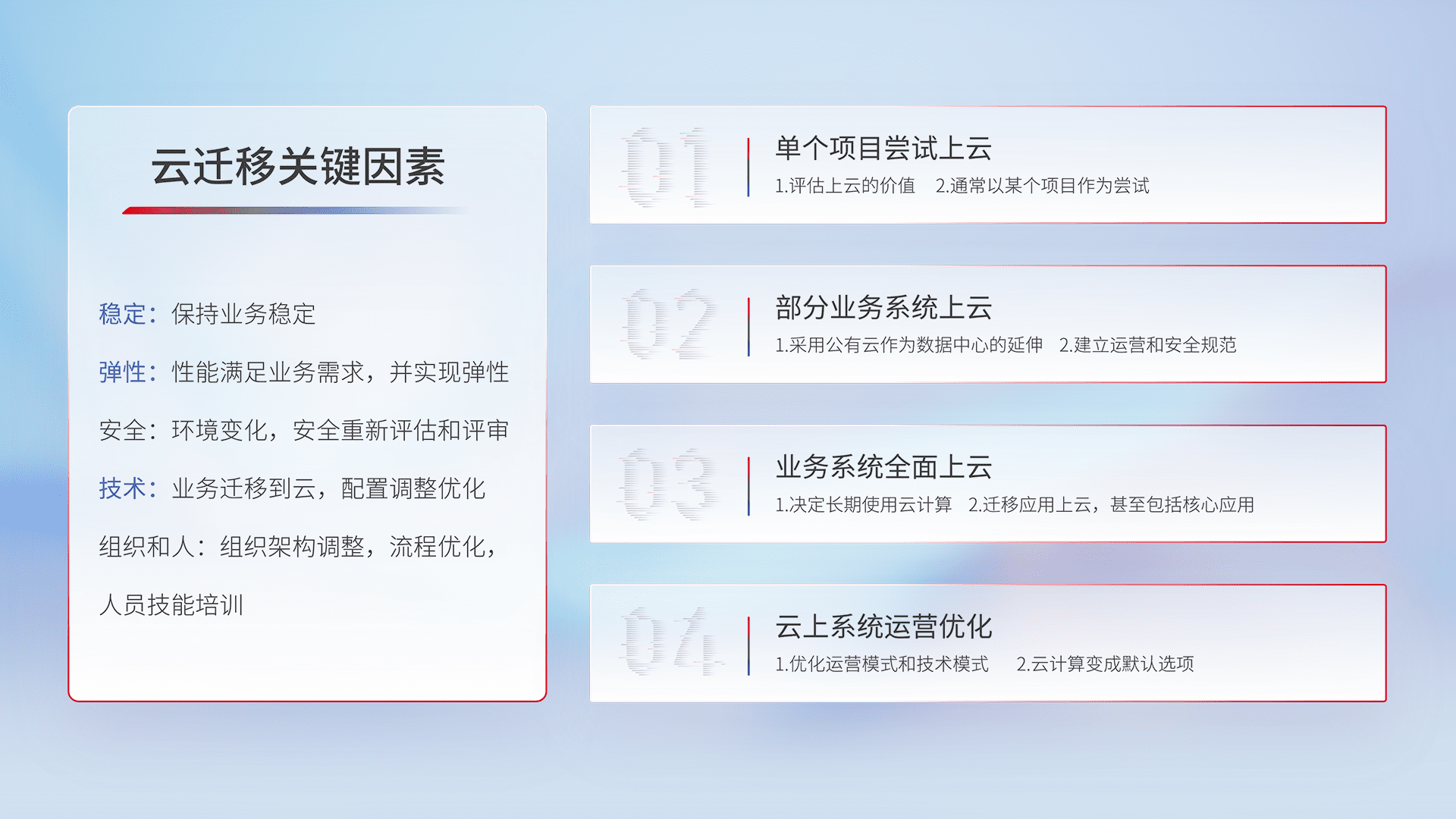 结合实际业务,,从规划设计、、云平台选型、、、、云原生改造、、、数据迁移、、集成交付,,,迁移全过程为客户识别最佳上云路径,,做好风险识别管理,,,设计网络架构、、、、身份权限、、、、安全审计合规、、操作审计、、、、日志审计、、、监控告警策略、、、多站点容灾设计等,,对云上基础设施进行整体规划,,,提升IT治理水平,,,以满足弹性、、高可用、、高性能的需求。。。