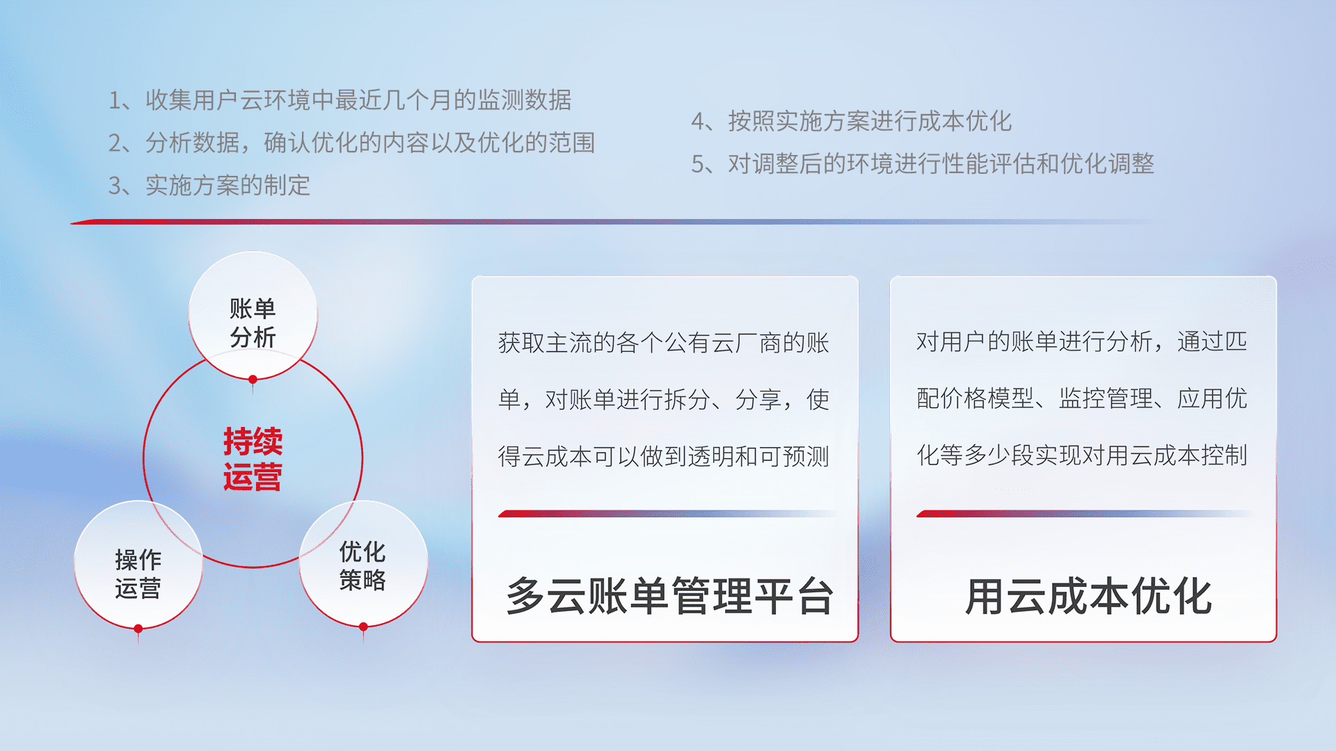 通过多云纳管,,,,以统一的资源数据模型把客户的云资源进行抽象和封装,,,进而实现对多云资源的统一操作,,保障云资源管理的可靠性、、稳定性与可用性。。。量身定制化运维内容,,配置、、、、开发运维、、、补丁管理、、、备份、、监控、、、认证和访问管理、、、、审计和日常巡检等,,,保障在用云过程中的可靠度,,,稳定度以及高可用率。。。